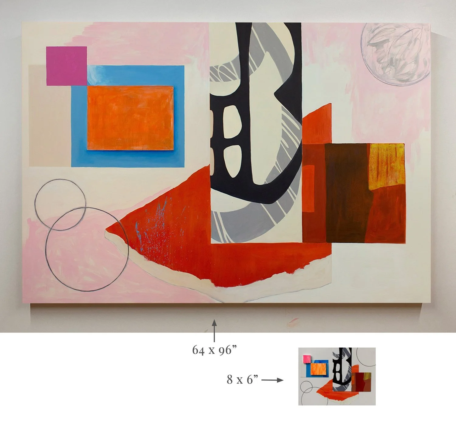 Abstract Interior (orange rectangle) and the tiny collage that inspired it (2021) oil, and charcoal on canvas, 64x96”